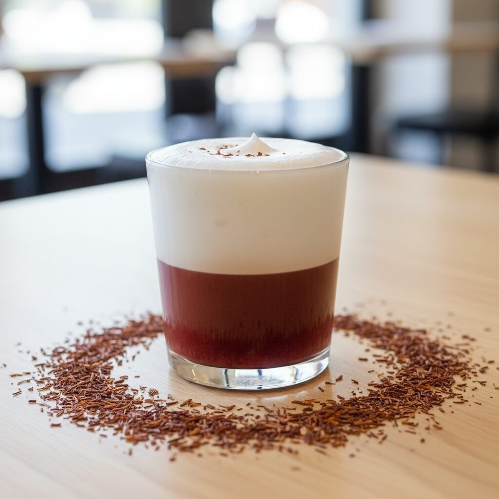 To replicate the espresso experience, you’ll need finely ground, ‘espresso-cut’ rooibos tea. You can brew a concentrated ‘shot’ using an AeroPress, a Moka pot, or your home espresso machine. The resulting brew is a beautiful deep red color with a rich, earthy flavor. Top with steamed, frothed milk just as you would a traditional latte for a completely caffeine-free, deeply satisfying beverage.