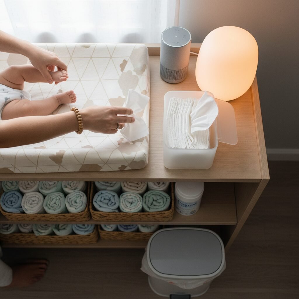 There’s a moment every new parent knows well: you’re mid-diaper change, your hands are… compromised, and you realize you need more light, a distraction for a fussy baby, or a fresh pack of wipes from the closet. Instead of calling for help or attempting a precarious one-handed maneuver, this routine turns your changing station into a smart, responsive environment.