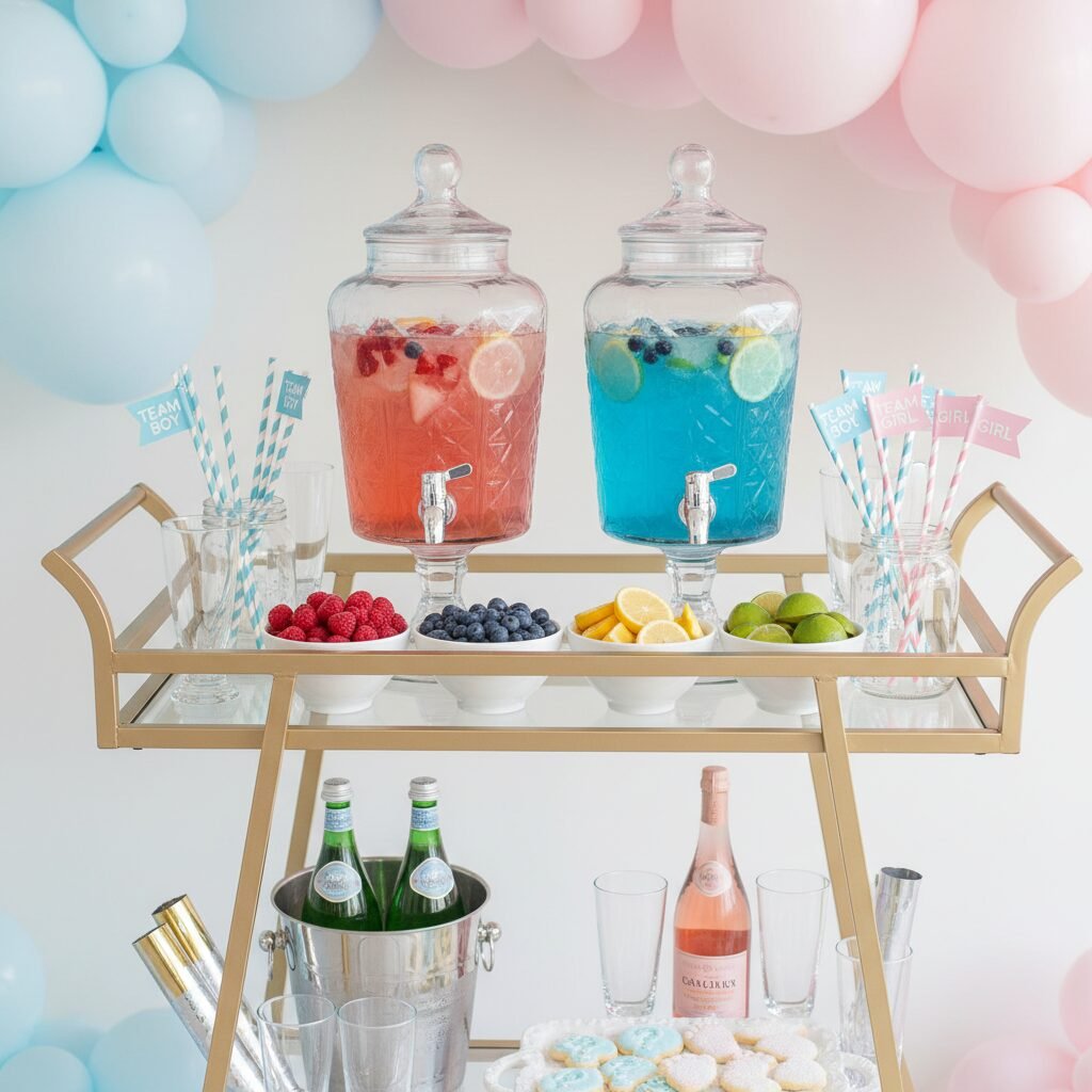 • Fun Extras: Themed paper straws, cocktail umbrellas, and fun stir sticks can tie everything into your gender reveal theme.