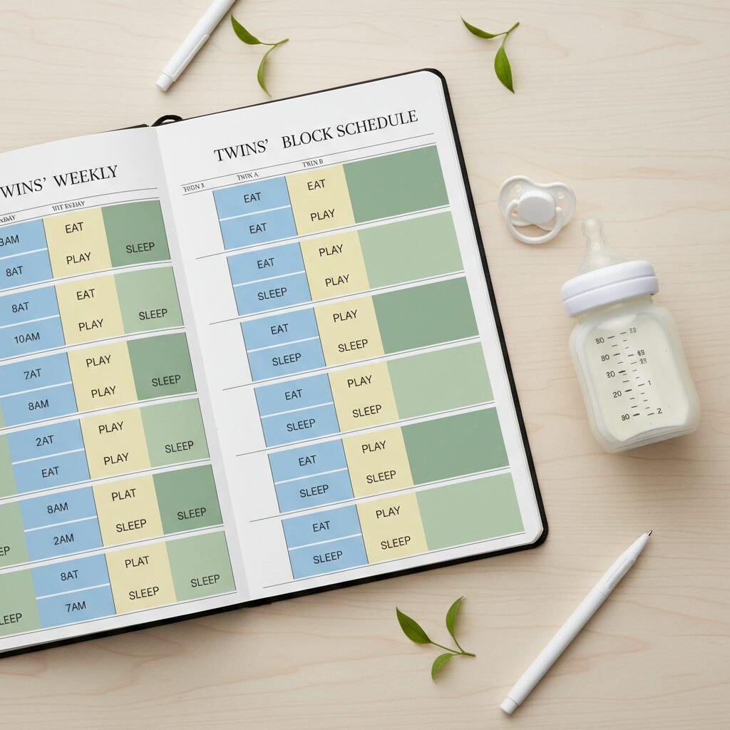 | 7:00 AM – 8:00 AM | Wake & Eat | Wake both babies (if they aren’t already awake). Tandem feed. This is your first ‘reset’ of the day. |