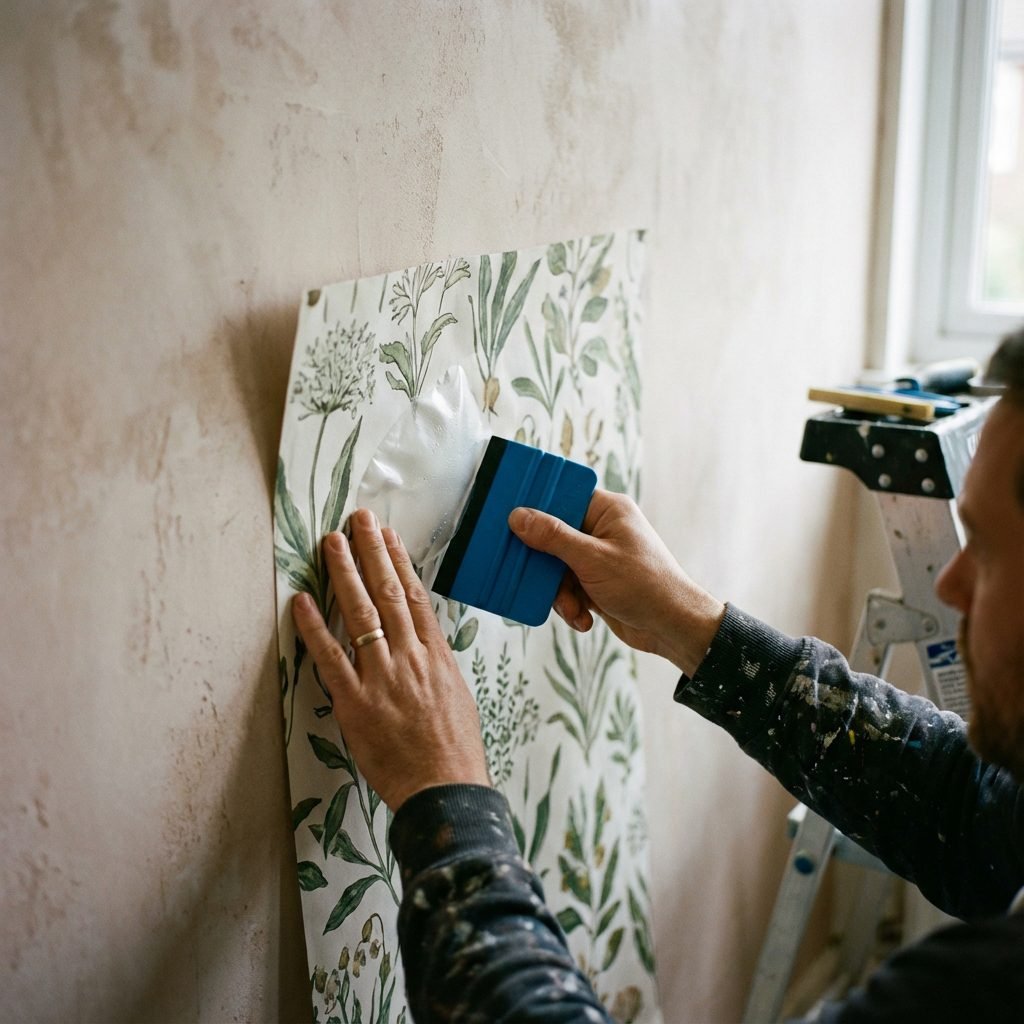 - Smooth as You Go: Working from the center out, use your plastic smoother to press the wallpaper to the wall. Continue to pull the backing paper down slowly with one hand while smoothing with the other. This method is the key to preventing air bubbles. If you do get a large bubble, gently peel back that section and re-apply.