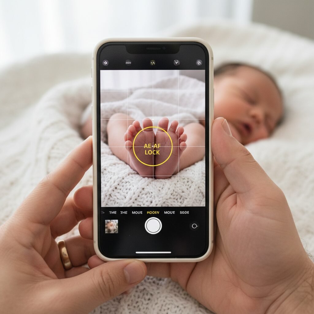 - Lock Focus and Exposure: Tap and hold on your baby’s face on the screen until you see the ‘AE/AF LOCK’ box appear. This locks the focus and exposure, ensuring that even if you or the baby moves slightly, the camera won’t constantly try to readjust, which can lead to blurry or poorly lit shots. Once locked, you can slide your finger up or down on the sun icon to manually brighten or darken the image.