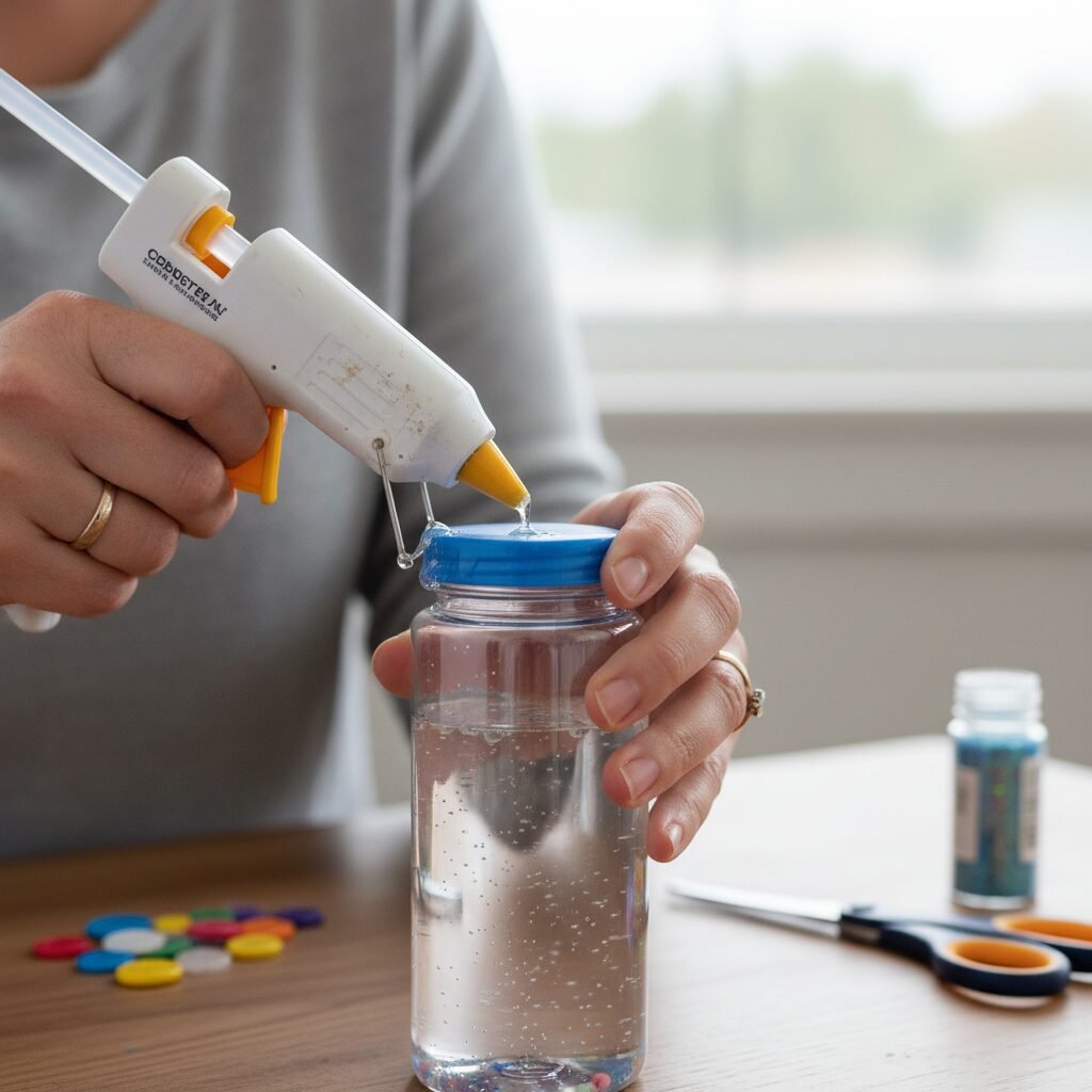 - What You’ll Need: A clean, clear plastic bottle (Voss or a similar smooth-sided bottle works well), water, clear glue or baby oil, and fillers like glitter, small plastic beads, sequins, or googly eyes. Non-toxic superglue.