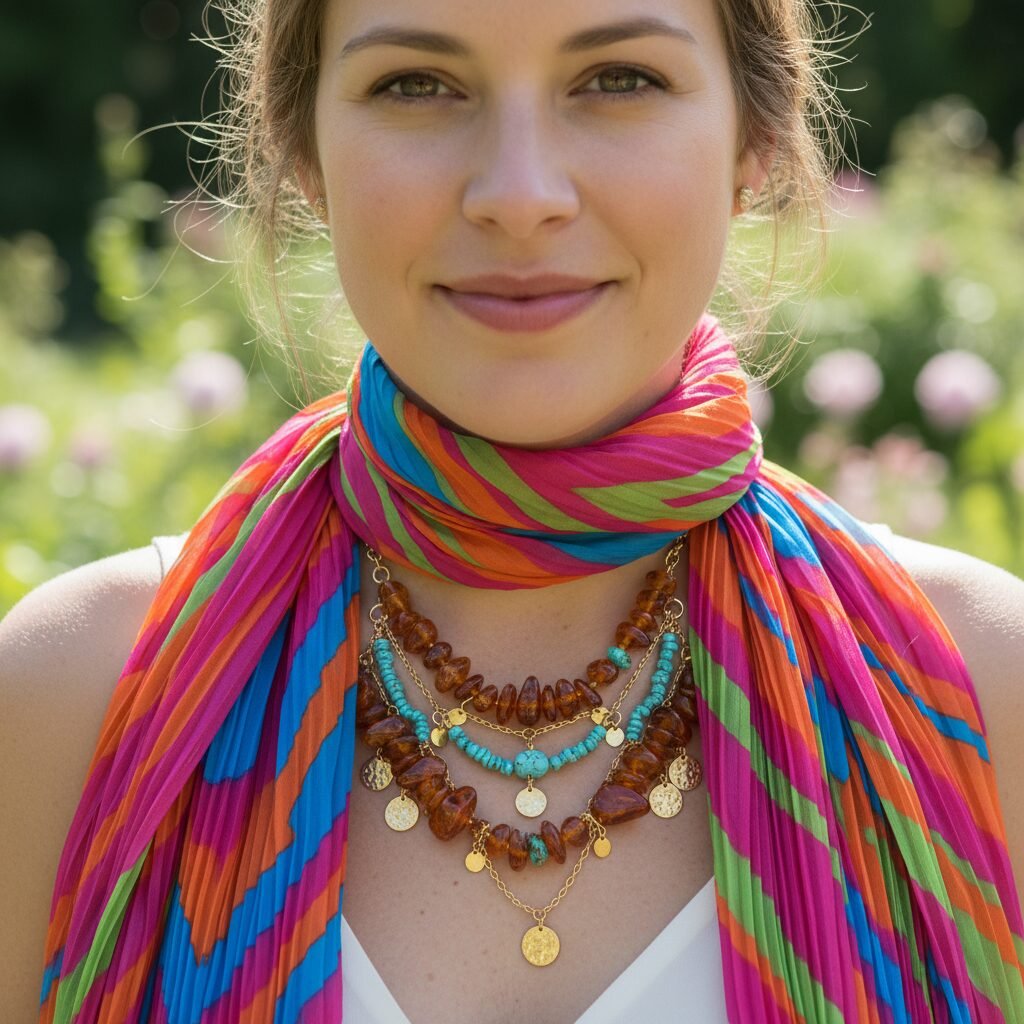 - Elegant Scarves: A loosely draped silk or cashmere scarf can be a lifesaver. It not only adds a touch of sophistication but also creates a vertical line that elongates your torso and cleverly conceals your midsection. You can tie it in various ways to suit your outfit.