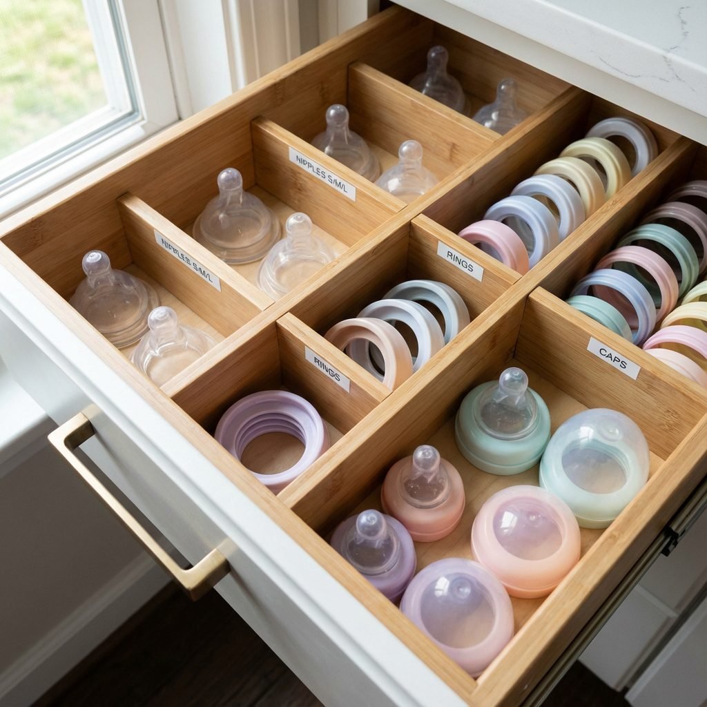 • Drawer dividers: Essential for keeping nipples, rings, and caps separated and easy to find. Look for adjustable or modular dividers to customize your space.