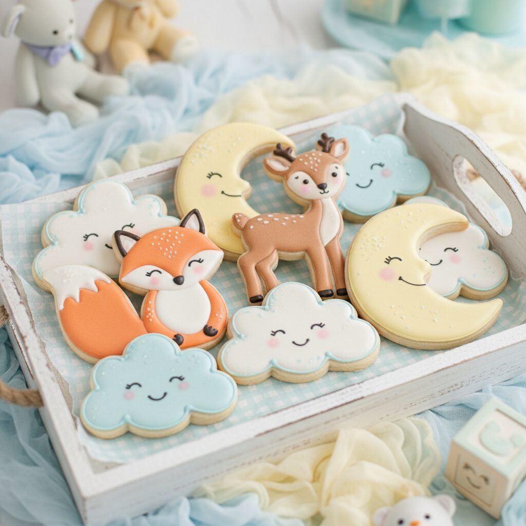 • ‘Twinkle, Twinkle, Little Star’ Set: A celestial dream. This popular theme is brought to life with a set of coordinating cookies, including fluffy white clouds, smiling crescent moons, and stars in varying sizes, often decorated in shades of yellow, silver, and soft blue.