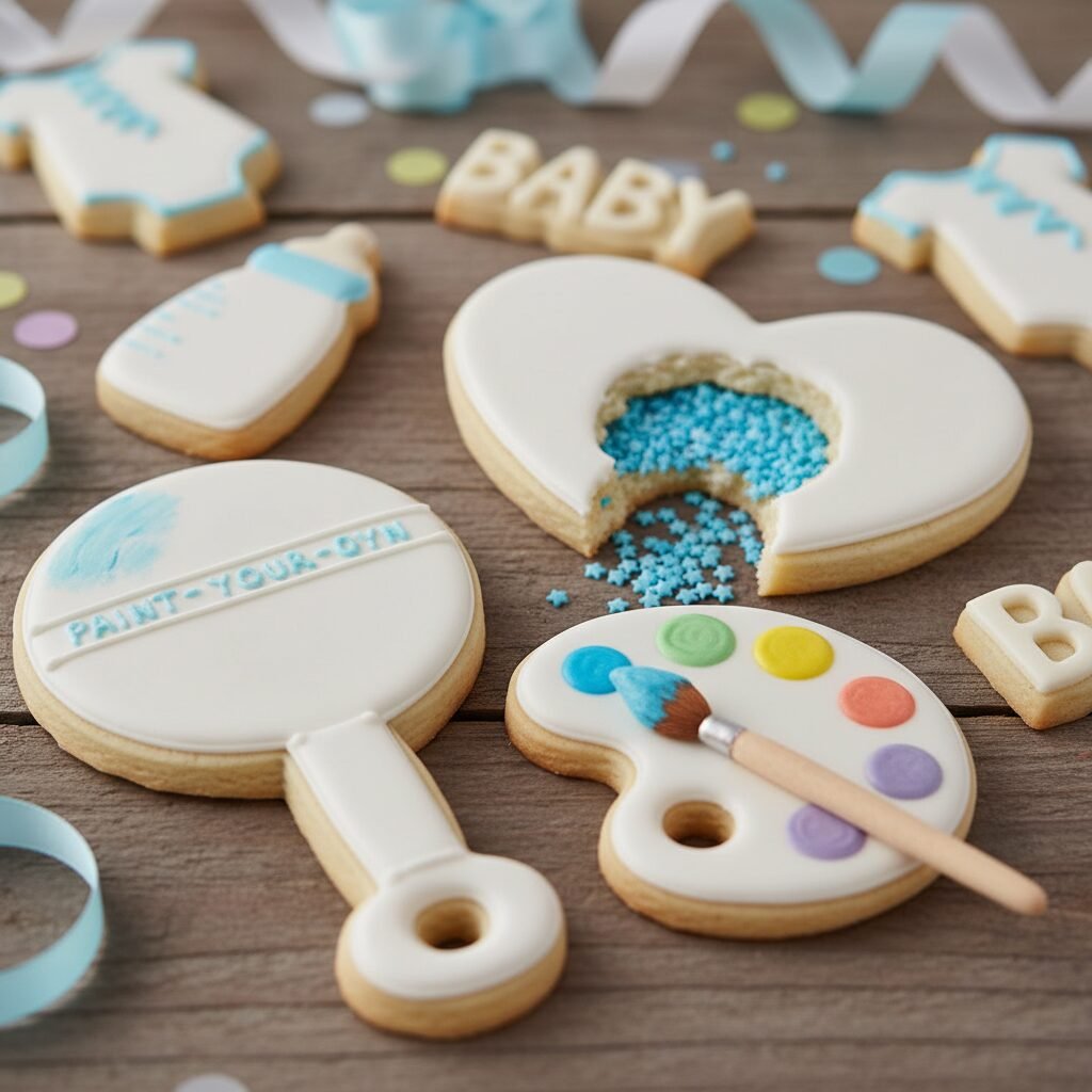 • ‘Paint-Your-Own’ (PYO) Cookies: A fantastic party activity and favor in one. These cookies are covered in a smooth, hardened layer of white royal icing and stenciled with a cute outline (like a baby animal or rattle). They are packaged with a small paintbrush and a palette of edible food coloring ‘paints’ for guests to decorate themselves.
